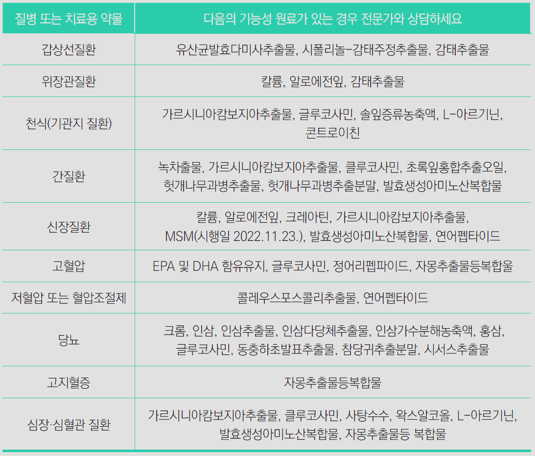 특히 수술을 앞두고 있거나 치료 중이라면 건강기능식품을 섭취하기 전 필히 의사 또는 전문가와 상담이 필요함.