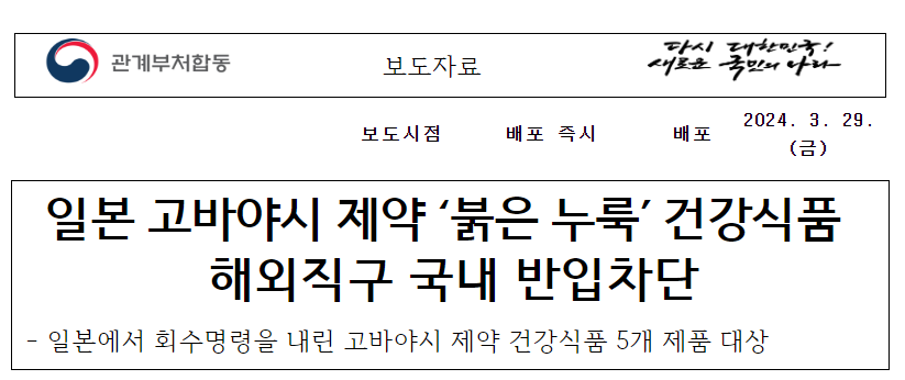 이에 식품의약품안전처(식약처)는 보도자료를 통해 일본 고바야시제약이 제조/판매한 붉은 누룩(홍국) 건강식품의 해외직구 및 국내 반입을 차단하겠다고 함.